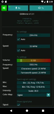 This application, called GGMorse, is designed to help users decode Morse code transmissions. It has a frequency range of 200 to 1200 Hz and a speed range of 5 to 55 words per minute (WPM). This means that it can decode Morse code signals that fall within these ranges.