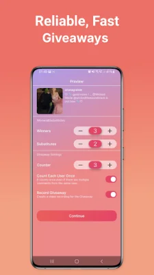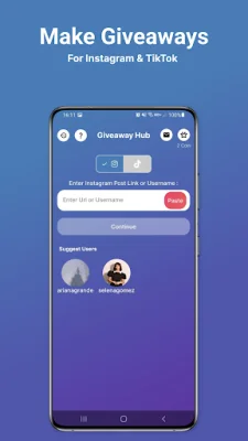 Giveaway Hub is an application that allows users to easily select winners for their Instagram or TikTok giveaways. With its key features, users can randomly pick one or multiple winners instantly and share the results directly with participants. The app's powerful algorithm ensures a transparent and fair process, eliminating the need for manual counting and double-checking. To use Giveaway Hub, simply add the link of your post to the homepage without having to log in. Then, determine the giveaway rules and winners. You also have the option to record your giveaway using the screen recording feature and easily share it with your followers. Once the giveaway settings are in place, start the giveaway and let the Instagram comment picker choose the winners. It's that fast and easy to do a giveaway with Giveaway Hub. What sets Giveaway Hub apart from other giveaway apps is its user-friendly design. The setup process is simple and the steps are easy to follow, ensuring a smooth experience for users. Additionally, the app is fast and accurate, saving users time with reliable and instant results. So why choose Giveaway Hub for your next giveaway? Not only does it offer a stress-free and exciting experience for both the host and participants, but it also allows for original and SEO-oriented giveaways. Don't waste any more time manually selecting winners for your giveaways. Download Giveaway Hub today and start picking winners the easy way!
