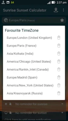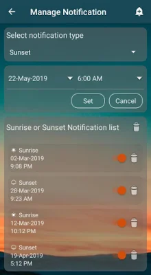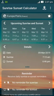 Never miss a sunrise or sunset again with timely notifications. You can set personalized notifications for upcoming events, ensuring that you never miss a moment. The user-friendly interface allows you to seamlessly switch between global locations and dates, making it easy to plan your day or reminisce on past sunrises and sunsets. You can also save frequently visited places as favorites for quick access.