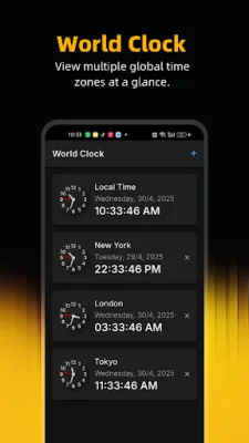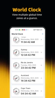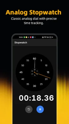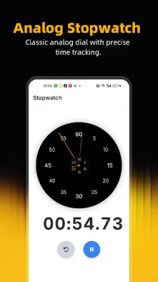 The application also offers a precise Stopwatch feature, perfect for timing events with high accuracy. The elegant analog design of the stopwatch adds a touch of sophistication, and its one-tap controls make it simple to use.