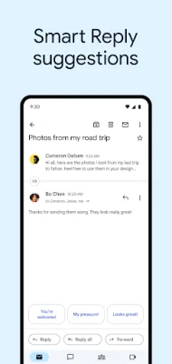 The app also offers helpful tools to increase productivity, such as Smart Reply suggestions that allow you to quickly respond to emails, and the ability to attach and share files with ease. You can also stay on top of new emails with fast notifications and easily search through your inbox with instant results and spelling suggestions.