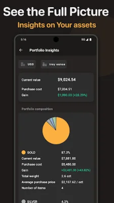 Goldo also offers an advanced portfolio tracker, which allows users to log all their gold and silver items and track their total investment value in real-time. This feature also allows users to track their gains and losses effortlessly, making it a valuable tool for serious investors.