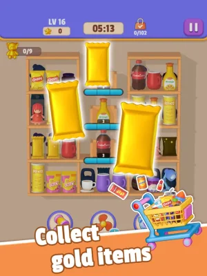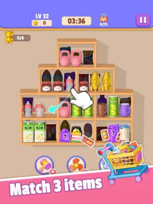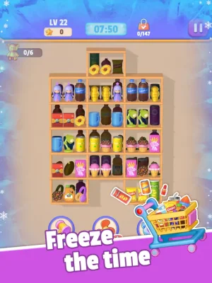 This application is a fun and challenging game that allows players to test their sorting skills in a virtual supermarket setting. The objective of the game is to place three identical 3D products on the same shelf and then sort and clear them, revealing the products behind the shelves. The player must continue sorting until all shelves are empty within a limited time frame in order to win the game.