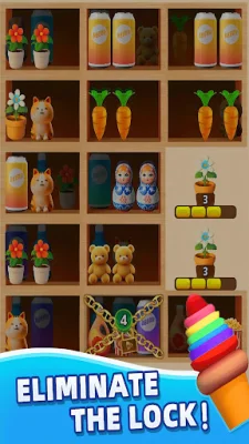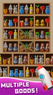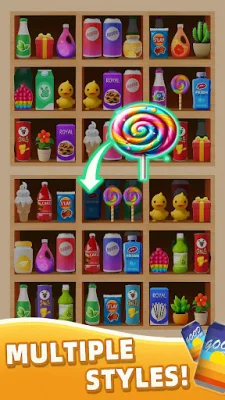 This application is a puzzle game that challenges players to sort through a chaotic mix of everyday items such as milk, coke, and cakes. The goal is to match identical products and clear the shelves. The game features intuitive controls and addictive gameplay, making it easy for players to pick up and play, but difficult to master.