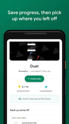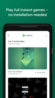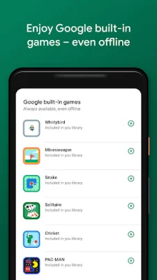 This application is a gaming platform that allows users to instantly play full games without the need for installation. It features a variety of built-in Google games such as Solitaire, Minesweeper, Snake, PAC-MAN, Cricket, and Whirlybird, which can even be played offline. The user's progress is automatically saved to the cloud when they see the message "Progress saved by Play Games," ensuring that they can pick up where they left off at any time.