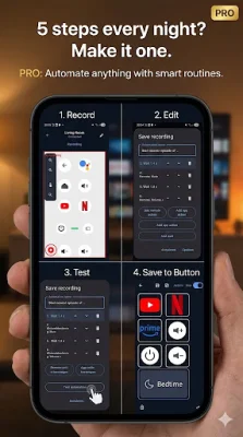 The app also offers automation features, allowing you to create routines for tasks like bedtime, news, kids' shows, and movie nights. You can record or build step-by-step actions and perform them with just one tap. The pro version also allows you to have unlimited devices, each with its own layout and automation, and you can quickly switch between them.