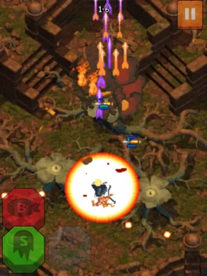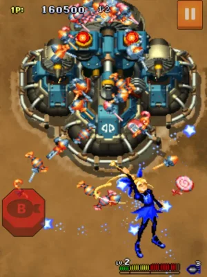 In addition to the traditional gameplay, the game also features a melee attack system where players can gather a gauge and approach enemies to deal powerful damage. Each character also has a unique skill that can be activated by pressing the super shot button. Players can also use bombs to protect themselves from enemies' attacks during moments of crisis.