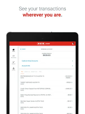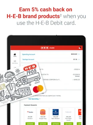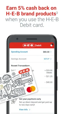 The H-E-B® Debit Account is a convenient and secure way to pay for your purchases from a trusted Texas company that has been in business since 1905. This account offers many benefits, including earning 5% cash back on H-E-B brand products when you use the H-E-B Debit card. There is no monthly fee to maintain your account, and with qualifying Direct Deposit, you may be eligible for a Purchase Cushion of up to $20 if you fall short on funds. You can also access your funds up to 2 days faster with Direct Deposit and make free cash withdrawals at H-E-B ATMs.