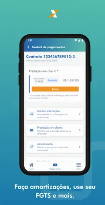 O aplicativo também permite que o usuário faça solicitações relacionadas ao uso do FGTS no contrato, como amortização, pagamento de parte da prestação e liquidação antecipada. Além disso, é possível emitir demonstrativos, alterar a data de vencimento, incluir ou alterar conta para débito e acompanhar informações sobre o imóvel em fase de construção.