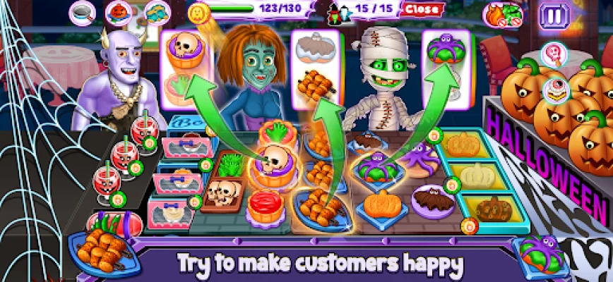 The restaurants in the Halloween valley offer a variety of dishes on their exotic Halloween menu, including sandwiches, donuts, pancakes, burgers, pizzas, hotdogs, cookies, pies, waffles, and more. As you play, you can practice your cooking recipes and serving abilities. The key is to tap as quickly as possible while keeping an eye on the time. Cooking has never been so much fun! You can also upgrade your kitchen appliances and food to enhance your gaming experience.