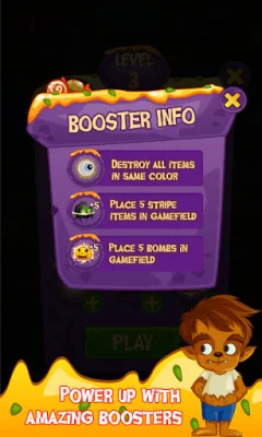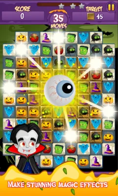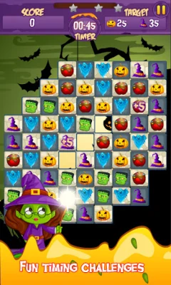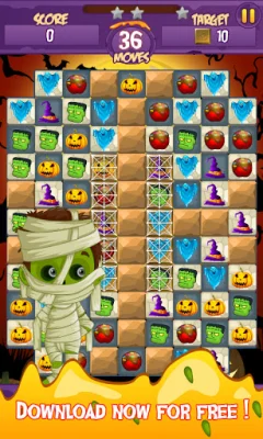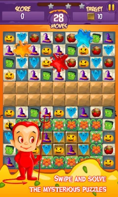 This application is a match-3 puzzle game with a Halloween theme. The objective is to match 3 or more magic icons of the same type to create a magical blast. The game starts out simple but becomes more challenging as you progress through the levels. The graphics are amazing and there are various items such as pumpkins, witch hats, and ghosts to match. Matching these items can reveal enhanced items like Magic Fire and Magic Boom, which can help you clear levels. You play as a cute little witch who is learning to cast spells and must solve puzzles presented by a powerful Wizard to advance through the magical world.