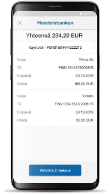 Vahvista-sovellus on kätevä ja turvallinen tapa kirjautua Handelsbankenin eri verkkopalveluihin ja vahvistaa maksuja ja tapahtumia. Sovelluksen avulla voit myös tunnistautua kolmansien osapuolien palveluihin, kuten vero.fi tai kela.fi, ja tehdä verkkokauppaostoksia. Vahvista-sovellus korvaa perinteisen avaintunnuskortin ja toimii kaikissa Handelsbankenin verkkopalveluissa.