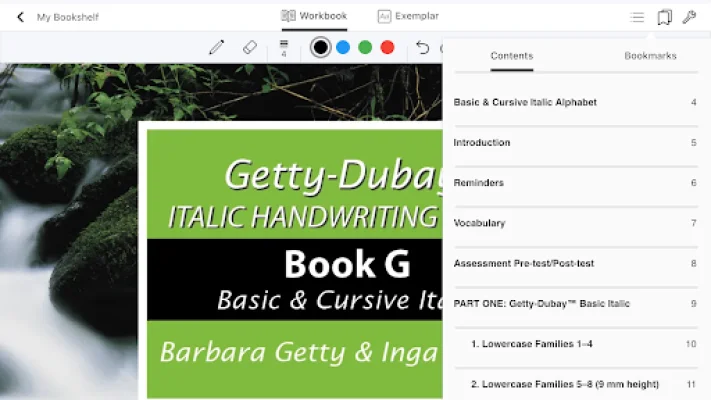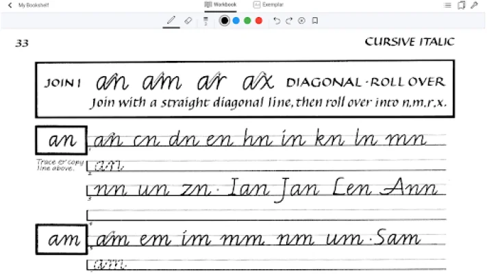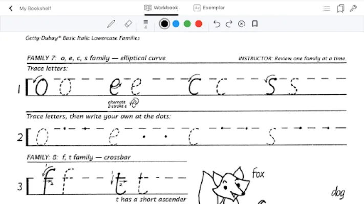The real fun begins when you use your stylus on the screen. You can choose the color, width, and opacity of your pen line, and trace and copy handwriting models while reading instructions and tips. The app also allows for easy erasing of work, either by selecting the eraser icon or erasing the entire page at once.
