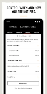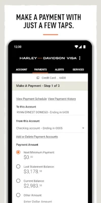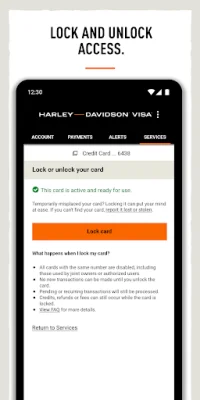 The app is free to download, but users should check with their mobile carrier for any access fees. It requires web access to use, and some features may require additional online setup. The creditor and issuer of the card is U.S. Bank National Association, licensed by Visa U.S.A. Inc. The app is affiliated with Harley-Davidson and is committed to protecting user privacy and security.