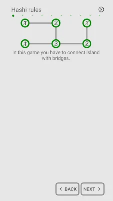 The goal of Hashi is to connect every island with as much bridges as the number on the island displays. Two connecting islands can either have one or two bridges. You win Hashi, when every island is connected either directly or indirectly with every other island. That means that they must build a closed network. But be aware, that bridges must not be crossing each other.