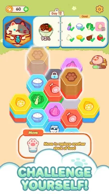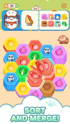 Hexa Food Sort is a thrilling mobile game that challenges players to command chaos by matching colors, mastering stacking games, and solving puzzles. The game is set in a bustling grid filled with vivid sights and various ingredients, with enthusiastic cat customers eagerly waiting for your culinary creations. Your goal is to achieve high scores by swiping ingredients across hexagonal cells and using your color-matching and combo-making skills to progress through levels.