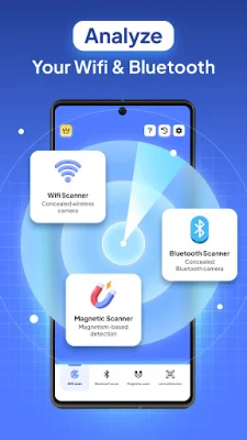 Protect your privacy effortlessly with our all-in-one hidden camera detector app. Whether you’re in a hotel room, Airbnb, or any public space, our app gives you the tools to find and eliminate hidden cameras with just a few taps. Our app offers multiple scanning methods to detect hidden cameras, including WiFi, Bluetooth, IR, magnetometer, and lens detection. With our app, you can easily pinpoint the exact location of detected cameras for complete safety in your surroundings. We also provide expert tips on common places where spy cameras are hidden and how to avoid them.