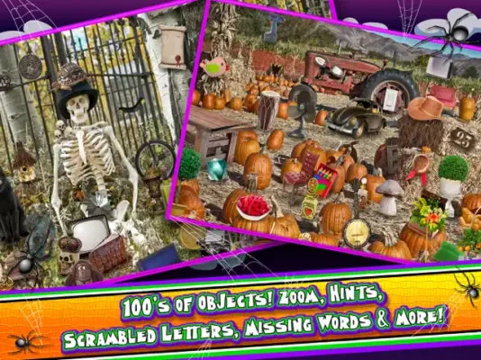 Some of the key features of this game include 40+ levels, the ability to zoom in to find objects, hints and timed challenges, and the option to drag and zoom the scene to search for objects. Players can also touch backgrounds to move up and down, and there are missing letters, scrambled words, and bonus objects to add to the challenge. The game also features real Halloween and autumn photos with hundreds of objects to find.