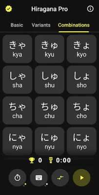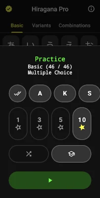 The Exercises application is designed to help users practice and improve their knowledge of the Japanese syllabary. It offers two main features: Practice and Quiz. In the Practice mode, users can earn points for each correct answer as they work their way through the syllabary. The Quiz mode challenges users to race against the clock and achieve the fastest time in each configuration.