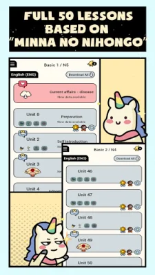 The app is available in multiple languages, including English, Vietnamese, Chinese, Indonesian, Khmer, Burmese, and Lao (to be updated). It offers two courses: Basic 1/N5, which covers Hiragana, Katakana, and Units 1-25, and Basic 2/N4, which covers Units 26-50.