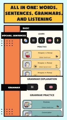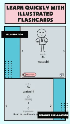 Users can expect to learn quickly and effectively with better memory retention through the app's features. These include automatic notifications for repetition based on the Forgetting Curve, flashcards with illustrations and native Japanese pronunciations, and a variety of practice questions and grammar explanations. The app also serves as a perfect tool for self-study and review, with the ability to focus on specific flashcards and learn or listen anytime and anywhere.