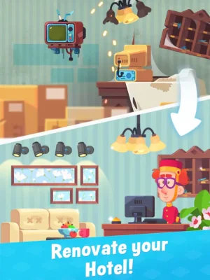 The gameplay involves merging objects such as broken tools, heirlooms, and décor pieces to create upgraded items and unlock new floors. As you progress, you can use these new tools to design and decorate the lobby, rooms, and gardens of your hotel. You have complete design freedom, allowing you to unleash your sense of style and create the hotel of your dreams. The game also combines adventure and business elements, as you must act as a hotel manager or business tycoon by hiring staff, managing services, cleaning rooms, upgrading facilities, and expanding your venture.