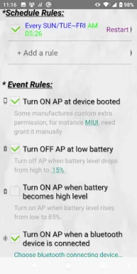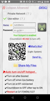 The app offers a variety of features to make sharing files and managing hotspots easier. Users can quickly switch between hotspots or open settings to share their 3G/4G/5G telecom network as a WiFi access point. They can also schedule hotspots to automatically enable, disable, or restart based on various date and time rules. The app also includes event triggers such as phone booting, Bluetooth device connecting, and battery level to enable or disable hotspots.