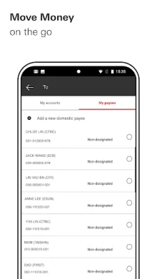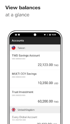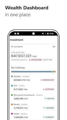 In addition to managing investments, the app also allows for various financial transactions. Users can move money and make bill payments, including foreign currency exchange, local currency transfers to HSBC or other domestic accounts, and payments for HSBC credit cards. The app also offers the ability to manage devices and security settings, and is optimized for accessibility.