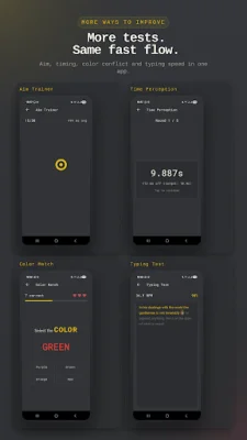 The app also allows you to track your progress and performance over time. Every test is measurable and recorded, and you can view detailed statistics, analyze trends with progress charts, and track your personal best scores. This allows you to monitor your improvement across all challenges and see how far you've come.