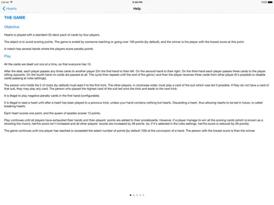 In order to play, the goal is to be the player with the lowest score when someone reaches or goes over 100 points. Each match consists of several hands, with 13 cards being dealt to each player. The player who plays the highest card of the suit led wins the trick and leads to the next one. This continues until the match is over.