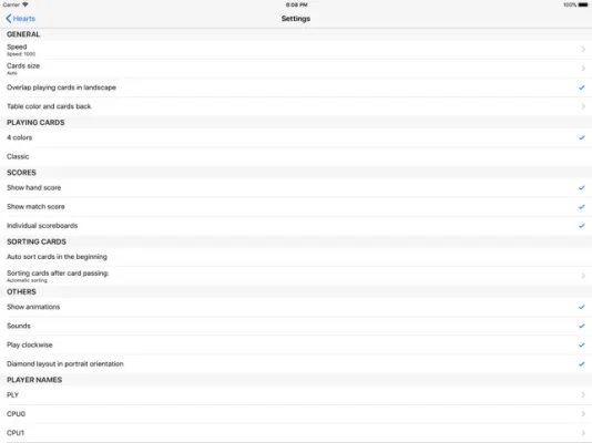 The Hearts application allows for both landscape and vertical orientations, making it easy to play on any device. Players can also save and load their game progress, making it convenient to pick up where they left off. The game also offers a variety of customization options, such as changing the color of the cards and table, and even displaying player names on the table cards.