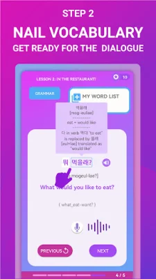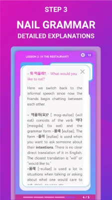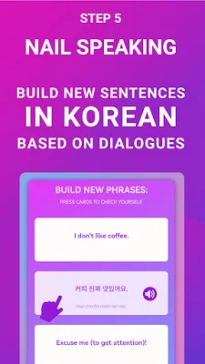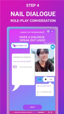 "I Speak" is a unique Korean language course that focuses on developing strong speaking skills through active exercises. Unlike traditional methods such as quizzes, flashcards, or chat texts, this course utilizes a speaking-only approach to ensure effective learning. It is designed for both beginner and intermediate level learners, promising to equip them with not only essential grammar and vocabulary, but also solid communication skills in just a few months. The course, which is suitable for TOPIK 1-2 level learners, boasts a record short completion time of 2-4 months. This is made possible through four key factors. Firstly, each lesson includes a specific exercise routine that helps students master grammar and vocabulary for fluency. Secondly, the course utilizes a Spaced Repetition algorithm to move learned material from short- to long-term memory. Thirdly, it focuses on the most frequently used 400 Korean words and 40 grammar forms, making up 50% of conversational Korean language. Lastly, the material is organized into 20 dialogue-lessons covering key topics relevant to K-wave fans and tourists, making learning engaging and efficient. By the end of the course, students will have reached a comfortable fluency level in day-to-day Korean conversations and activities. They will be able to confidently communicate with locals when traveling to South Korea. This course is best suited for elementary-intermediate level students (A1, A2+, or TOPIK1) who may struggle with speaking and using learned grammar and vocabulary. With daily practice of 1-2 exercises (10-20 minutes), students can complete the course in 2-4 months. For those looking to focus on academic Korean, such as in-depth grammar or broad vocabulary, other learning programs may be more suitable. "I Speak" is specifically designed for day-to-day Korean conversation. The course covers the basics of Korean language, including the most frequently used grammar structures and vocabulary used by common Koreans in their daily lives. It has been tailored to fit the interests of K-Pop and K-drama fans traveling to or within South Korea. The material is presented in 20 exciting dialogues to make learning lively and meaningful. By the end of the course, students will be able to confidently interact with locals on day-to-day topics in South Korea. Install now to check out the lesson previews and experience this unique and effective Korean language course for yourself!