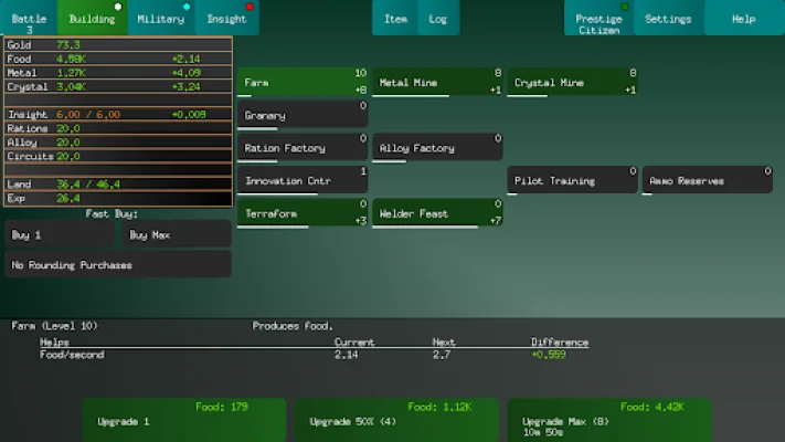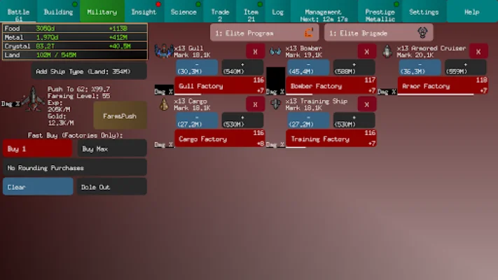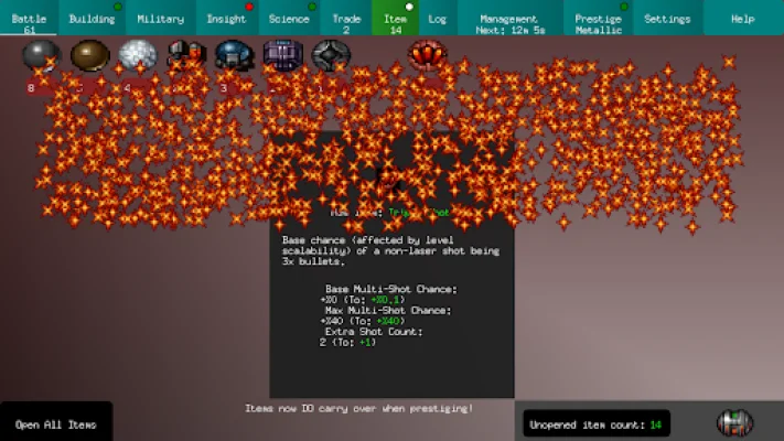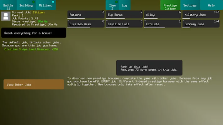 This application is a growing game that offers a variety of features to keep players engaged. It currently has 84 prestige bonuses, which are spread across 7 different jobs. There are also 11 different types of ships, 32 buildings, and 21 collectable items for players to discover and utilize. In addition, there are 8 "Insight" upgrades and 5 "Science" upgrades that players can purchase to enhance their gameplay experience.