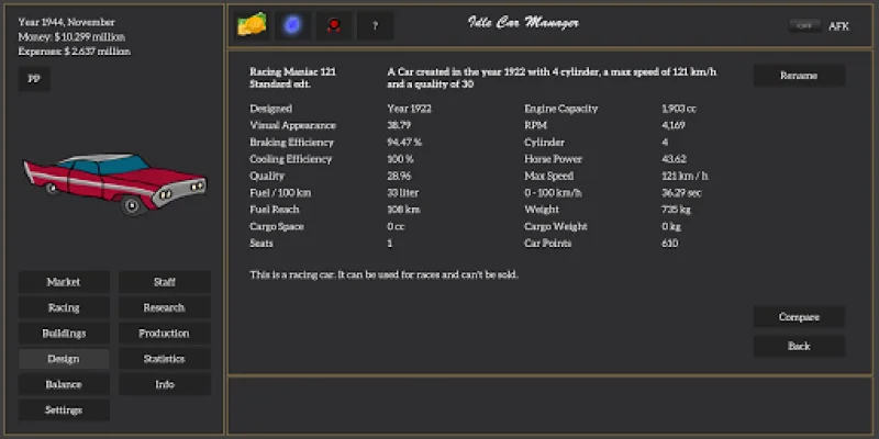 But it's not just about being a skilled driver. In this game, you have the opportunity to design and customize your own car, making it unique and perfect for your racing style. You can also research and upgrade car parts to give yourself an edge over your competitors. However, be careful with your decisions because if you make mistakes, your company could go bankrupt and your racing dreams will come to an end.