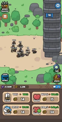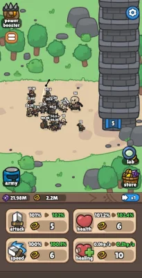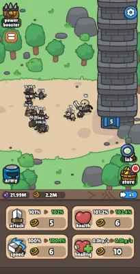 Idle Castle Breaker features powerful progression systems, including the Power Booster, which allows players to upgrade core stats like ATK, HP, and Gold gain to accelerate their progress. The Lab System allows players to unlock and enhance special attributes for long-term growth, and the Main Screen Upgrades allow for instant boosts to ATK, HP, Attack Speed, and Regen with just a tap.