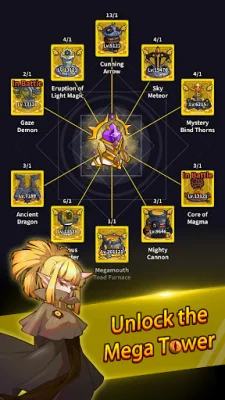 The game features over 10 types of towers with different functions such as arrow, magic, stone, and poison. These towers can be upgraded and evolved to gain more power. In addition, players can use elemental skills like lightning, frost freeze, and breeze wind to defeat the monsters. The research system allows players to improve the power of their towers through more than 10 research options. They can also summon ancient demons to help them in battle, with 16 demons currently available and more to come in the future.