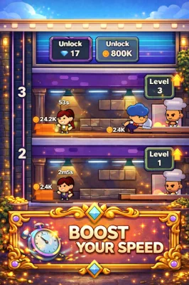 But the fun doesn't stop there - in this idle clicker game, your staff will continue to work hard even when you're not playing. This means you can collect massive offline earnings and use them to make instant upgrades, perfect for busy players who want to progress without the endless grind. And with strategic upgrades like faster ovens or more waiters, you can analyze your statistics and optimize your food management strategy for maximum efficiency.