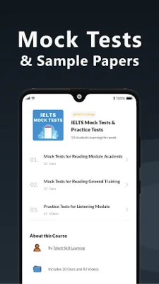 The IELTS Exam preparation App is a one-stop-shop for all IELTS preparation needs. It offers a variety of features, including access to over 100 IELTS tests with 4000 questions, detailed model answers for Writing Tasks 1 and 2, and GT Writing Task 1, as well as Reading and Listening tests. The app also provides exercises for all skills, such as speaking, reading, writing, and listening, along with helpful tips and ideas for the exam. Users can also benefit from over 50 sample essays, a list of 5000 common words, and resources for idioms, phrasal verbs, and irregular verbs.