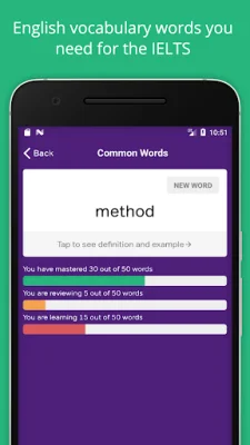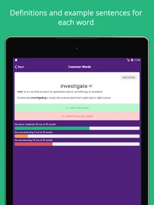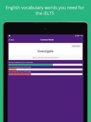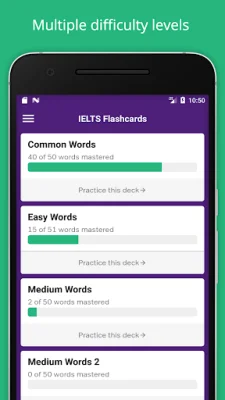 Each word comes with a complete definition and example sentences, making it easier for you to understand and remember their meanings. The app also offers flashcards for different difficulty levels - easy, intermediate, and advanced - so you can tailor your learning experience to your own pace and needs.