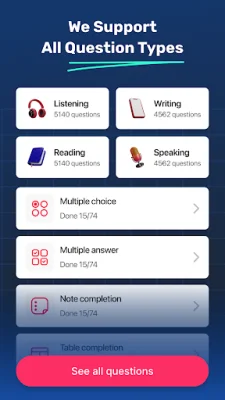 In addition to practice questions, One IELTS also offers real exam simulations based on Cambridge IELTS editions. These timed tests simulate actual exam conditions, helping users manage their time and improve their performance. The app also features a fast AI scoring system, providing instant feedback on Writing and Speaking tasks and accurately tracking one's progress over time.