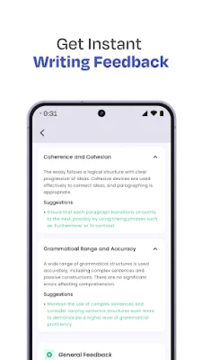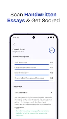 The AI IELTS Writing Scan & Score app focuses on improving users' writing skills for both Task 1 and Task 2. It allows users to upload handwritten essays, which are then evaluated by the AI with high precision. The scoring is based on Task Achievement, Coherence, Vocabulary, and Grammar, and the app provides structured suggestions to help users reach a Band 7 or higher. This app is a faster and more affordable alternative to human essay checking, providing users with real and actionable feedback.