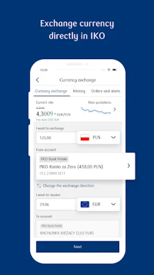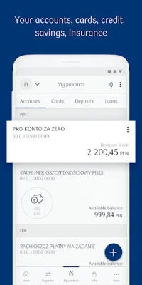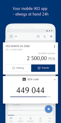 The app also offers additional functionalities such as mobile authorization, public transport tickets, parking fees, and standing orders for charitable purposes. Users can also receive push notifications and use the app in multiple languages. Personalization options are also available, such as changing the main screen view and product names. The app also offers a shortcut button for favorite functions on the home screen and the ability to create and share QR codes with transfer details. Users can also view currency exchange rates and locate PKO Bank Polski branches, ATMs, and stores that support BLIK payments on a map.
