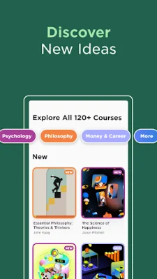 The app features a rapidly expanding catalog that includes courses, quick reads, and visual guides to bestselling books. Some of the courses offered include "Philosophy and the Meaning of Life" with Professor John Kaag, "Bitcoin and Blockchains," and "The History of the United States Government." Quick reads cover topics such as "The Freudian Mind: Id, Ego, Superego," "NFTs: A Visual Guide," and "You Are What Your Gut Bacteria Eat." Imprint also offers visual guides to popular books like "Sapiens" by Yuval Noah Harari, "Atomic Habits" by James Clear, "The Beginner's Guide to the Stock Market" by Matthew Kratter, and "ADHD 2.0" by Dr. Edward M. Hallowell and John J. Ratey.