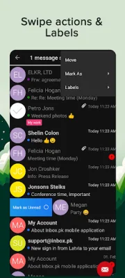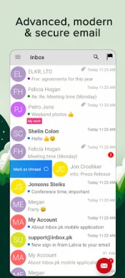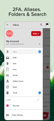 The advanced version of the app offers even more features, such as the ability to label messages, change signatures, send messages from aliases, and choose sound notifications. It also has a larger storage capacity of up to 20GB or 100GB. Users can also manage and create folders, choose from a variety of color themes, and activate a "Do not Disturb" mode from 22:00 to 7:00.