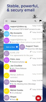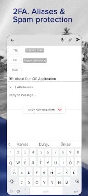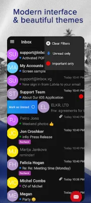 In addition to these main features, the application also offers other useful tools such as the ability to change your signature, send messages from aliases, and sync your contacts and calendar. You can also customize your experience with options like home screen widgets, choosing a sound for notifications, and creating and managing folders. Plus, you can choose from a variety of beautiful dark or other color themes to personalize your inbox. And for those times when you need some peace and quiet, there is a "Do not Disturb" mode that can be set from 22:00 to 7:00.
