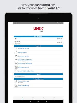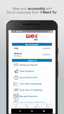 The app also offers other user-friendly features, depending on the user's account(s). This includes the ability to take or upload a picture of a receipt and submit it for a new or existing claim. Users can also view, contribute, and distribute HSA transactions, as well as pay bills from any account and add a payee. The app also allows users to manage their expenses by entering medical expense information and supporting documentation. They can also view and manage their HSA investments through the app.