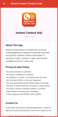 Privacy is a top priority for Instant Contact Hub, and the app follows a strict no-tracking policy. This means that user activities, searches, and usage patterns are never monitored, ensuring complete privacy for users. In case of any questions, suggestions, or requests for contact numbers, users can reach out to the app's support team via email.