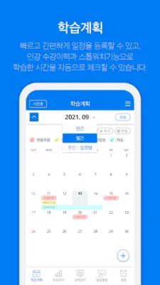 학습계획 기능을 통해 빠르고 간편하게 월간/주간 계획을 설정하고 확인할 수 있으며, 인강 수강 이력과 스톱워치 기능을 통해 학습한 시간을 자동으로 체크할 수 있습니다.
