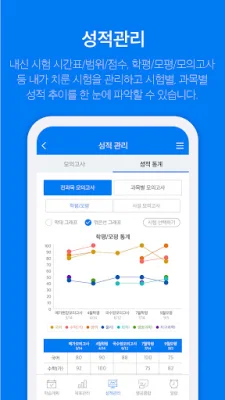 성적관리 기능을 통해 메가스터디 채점서비스와 연동하여 시험별/과목별 성적 흐름을 확인할 수 있으며, 직접 시험 응시 과목/점수를 입력하여 관리할 수 있습니다.