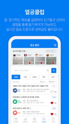 열공클럽 기능을 통해 중, 장기적인 목표를 설정하고 실시간으로 열공인증을 통해 친구들과 소통할 수 있으며, 선의의 경쟁과 목표 달성 성취감 상승으로 동기부여가 가능합니다.